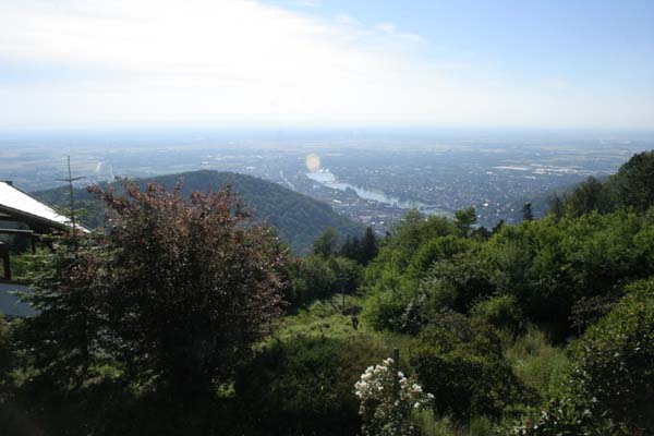 View from Königsstuhl of Heidelberg and the river Neckar, which flows toward the river Rhine, visible that day 20 KM off in the distance.