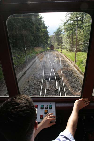 The second Königsstuhl cable car is an old wooden contraption that rumbles up the 40 degree grade from the castle to the top station.