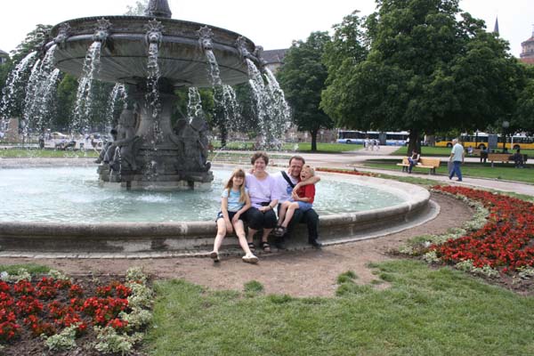 Happy little family from America, posing in front of one of Stuttgart's big, pompous Schlossplatz fountains.