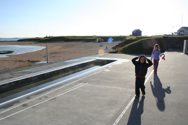 On our first day in Iceland: Jacob and Julia next to the warm water pool at Nauthólsvik geothermal beach. The pool is drained here, because the facility closes at 8:00 P.M. On the left you can see the other pool in the bay.