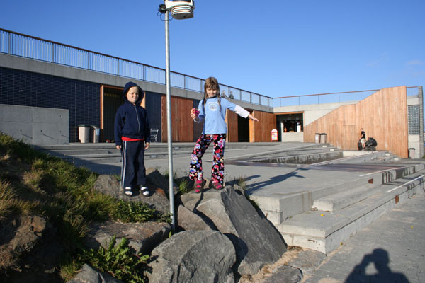 An unserem ersten Tag in Island albern Jacob und Julia vor den Umkleideräumen, Imbissbude und den Warmwasserbecken des Thermalstrands von Nauthólsvik herum.
