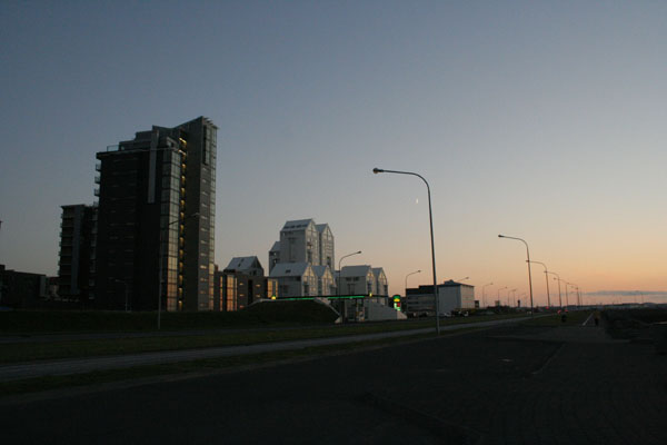On our first day in Iceland, I stayed up to see the midnight sun. Buildings at the waterfront - well after midnight.