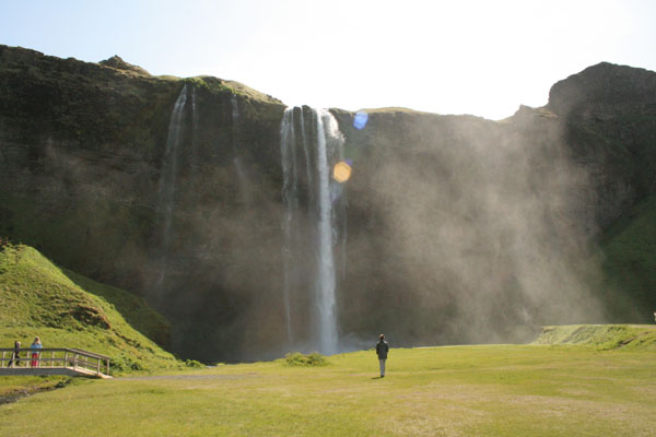 Seljalandsfoss kann man schon von der Ringstraße sehen. Dieser Wasserfall ist für Regenbögen bekannt.