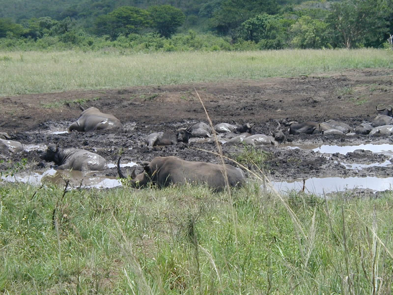 Two animals with a distinct reputation for being big and grumpy - rhino and buffalo - peacefully wallowing in the fresh mud.