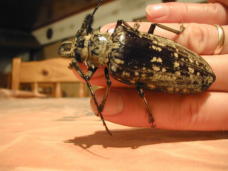 Many thanks to James Harrison of the Transvaal Museum, who identified this beetle as Tithoes maculatus Fabricius (CERAMBYCIDAE: PRIONINAE). See also: front view.