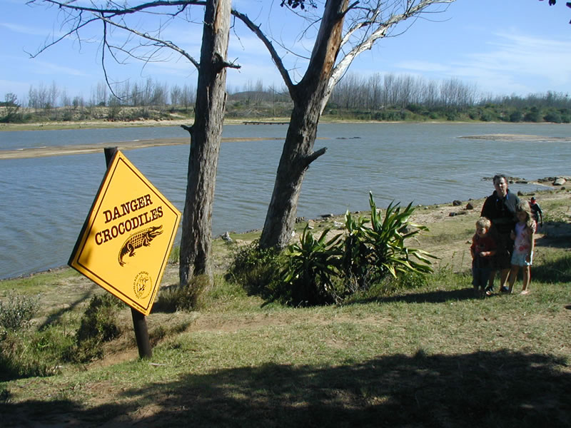 Hippos in the water (near the sandbank, right of the right tree) and crocodile warnings. This is not a place for a swim!
