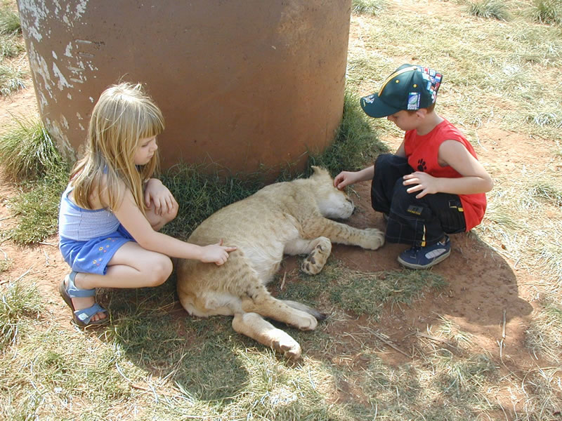 ![]() Karl and Julia were right to be careful with the "little" lion. As used to humans as they are, they are not really tame. And they weigh roughly what each of the kids weighs. The cub's paws are about the size of the children's hands - except the cub's paw has claws and even a playful swipe with that paw can do some real damage. On the other hand, the unique experience of petting a lion cub certainly seemed worth the slight risk. |