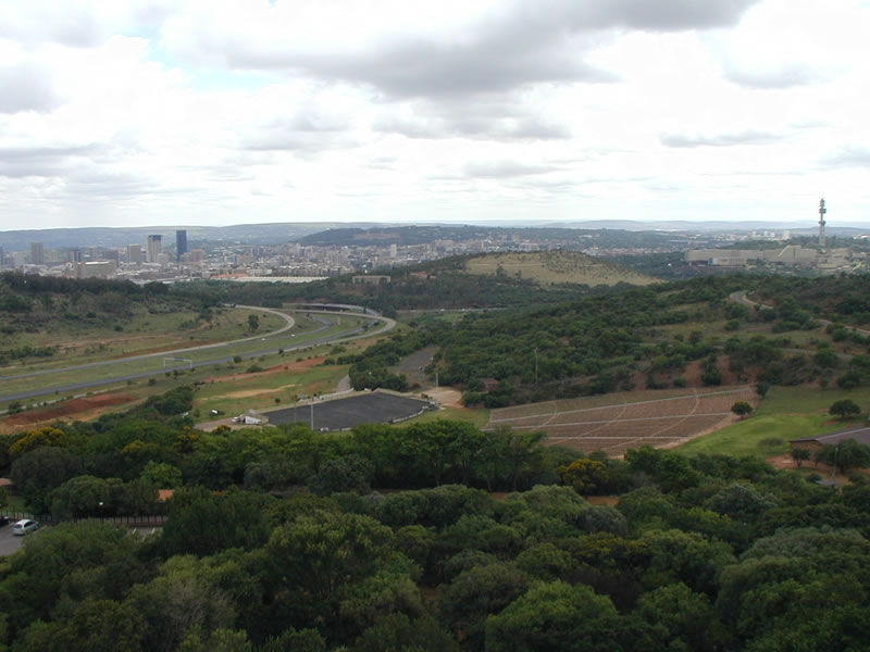 From the top of the monument, visitors have a commanding view of Pretoria and the surrounding hills. Downtown Pretoria is on the left, the Union Building is visible on the green hill on the opposite side of the city. The white high-rise right underneath the Union Building is the Hotel 224.