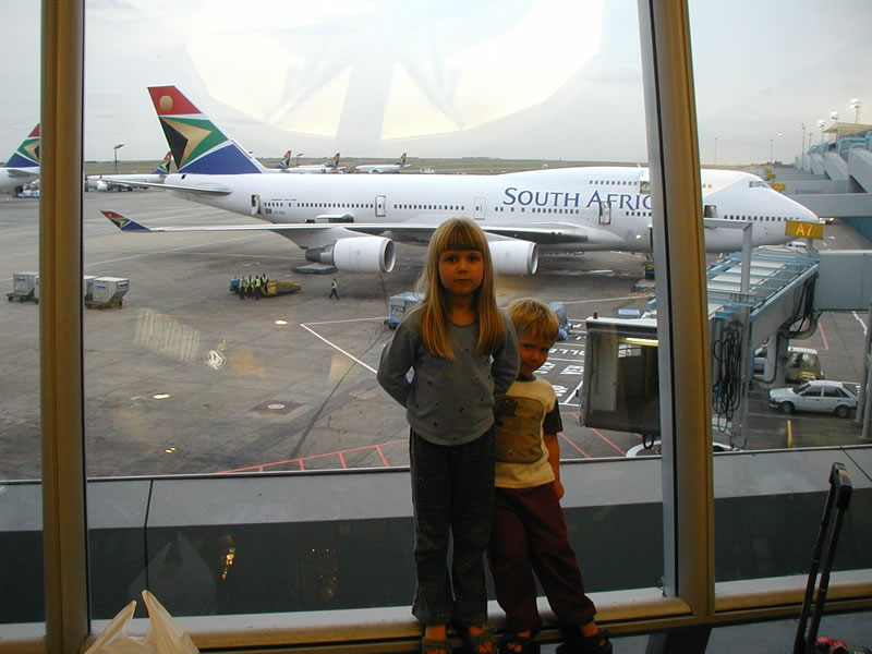 ![]() At the Johannesburg airport, Julia and Jacob pose in front of the plane that took us back home. The Atlanta-Jo'burg route is one of the longest commercial plane flight in the world: a 16 hour non-stop flight - even this extended-range Boeing 747-600 can just barely make it. On the way back, they have to land in Cap Verde, off the coast of Senegal, to refuel. That makes the trip back take roughly 19 hours. |
